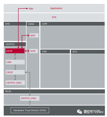 Crypto (HW)模塊作為訪問安全算法和函數(shù)的驅(qū)動(dòng)程序,通過硬件信任錨(HTA)提供。有不同的HTA類型,如安全硬件擴(kuò)展(SHE)和硬件安全模塊(HSM)。