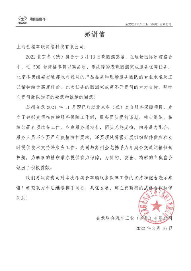 上海創(chuàng)程收到感謝信啦
