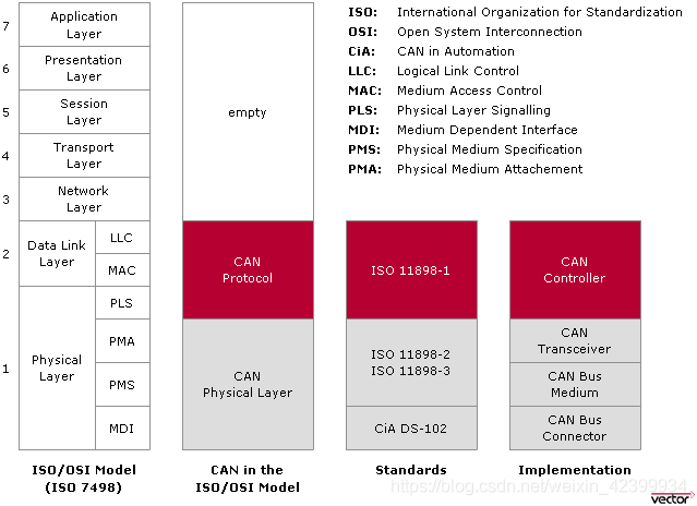 CAN底層標準都相同,涵蓋OSI模型中的物理層和數(shù)據(jù)鏈路層,與ISO/OSI模型的對應(yīng)關(guān)系如下圖所示: