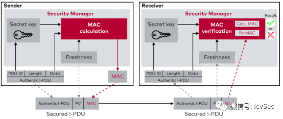 SecOC模塊,也稱為身份驗(yàn)證消息,用于驗(yàn)證兩個(gè)ecu之間的通信。這種驗(yàn)證可以防止第三方注入或仿冒正確的通信伙伴。