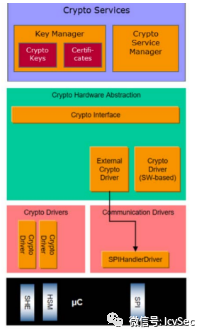 基于硬件的加密功能,由安全硬件擴(kuò)展(SHE)或硬件安全模塊(HSM)通過加密(HW)模塊實(shí)現(xiàn)。